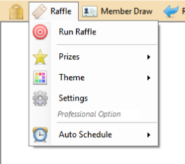 Raffle Menu ItemsThe "Run Raffle" menu item is not active by default. When you have completed the required settings the menu item will be available to select. To enable a Raffle you must select a Prize List, you may need to create a Prize List in Global Settings if you have not created it already. Choose your Theme from the Theme menu. Complete the Settings for your Raffle draw, including available tickets for the draw. Once these are validated and saved the "Run Raffle" menu item will turn red and be available to select. The Auto Schedule allows you to schedule upto 3 regular draws to activate and run automatically. |