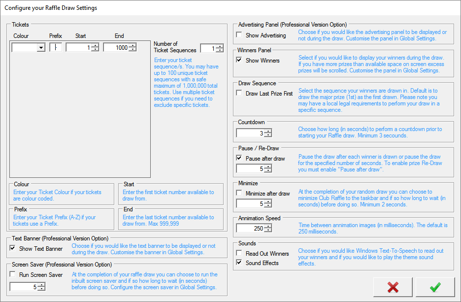 Raffle SettingsClub Raffle allows you to define your raffle tickets is a number of ways. It is designed to be used with the cheap and easily available tickets you can obtain from most stationery stores. You can even order them online from Officebarn if you are in Australia. You can define your tickets with a Colour, Prefix and of course number. Colour is limited to 6 basic colours, Prefix can be any character A-Z and the number can be any number from 1 to 9,999,999. Colour and prefix are optional and if you specify more than 1 ticket range they must not overlap, that is each ticket defined must be unique. You may define upto 100 ticket sequences, and you can use this feature to exclude tickets from the draw. If you have a large number of excluded tickets it may be easier to use the Members Draw random draw method and create a text file with your included tickets. Choose if you would like the Text Banner to be displayed during the draw or not. Setup your banner in Global Settings. Choose if you would like the Screen Saver to activate after the draw is complete, if so specify how long after the draw has completed before the screen saver kicks in. Choose if you would like the Advertising panel to be displayed or not. Setup your panel in Global Settings. Choose to display the winners panel or not. Setup your Winners panel in Global Settings. Choose your draw sequence. Club Raffle will allow you to draw your 1st prize first or last. Set the number of seconds you would like to countdown prior to the draw commencing. Choose if you would like to pause the draw after each winner is drawn or specify the number of seconds to wait before the next winner is drawn. If you would like to be able to redraw a winner (for example if the prize is declined or not to be awarded for some reason) you must set Club Raffle to pause after each winner is drawn. Choose to minimize the Club Raffle software to the system tray after the draw has been completed or not, and how long to wait before doing so. If you are using the Auto Schedule feature you must ensure Club Raffle continues to run after the draw. If you would like to speed up or slow down the animation you can make adjustments to the animation speed setting. To increase the speed of the animation you enter a lower number, you can slow down the animation by increasing the number. The animation speed is also dependant on your computer's processing power so your results may vary. Choose if you would like Club Raffle to read out the winners.Club Raffle will use the Microsoft Text-To-Speech technology to read out the winners and based on your Windows settings you may get different results. Finally choose if you would like the sound effects to be played during the animation. |